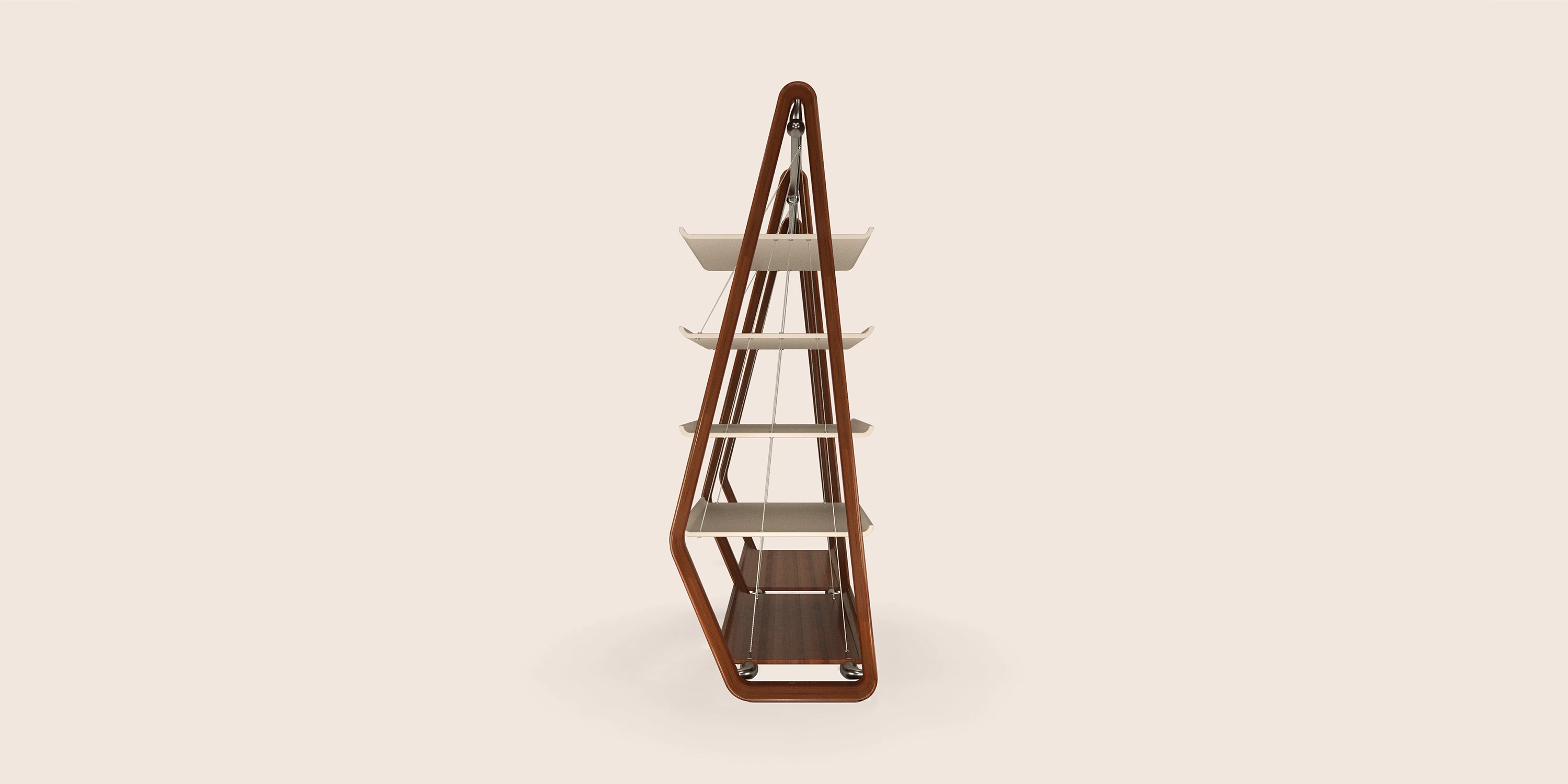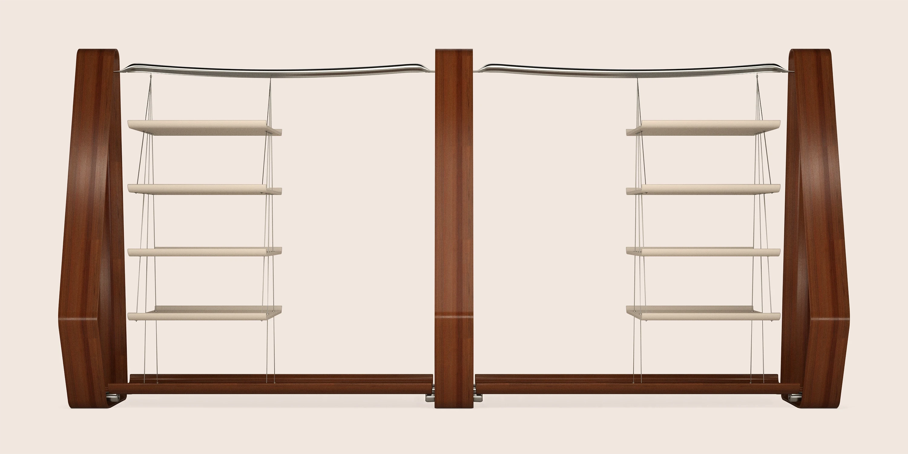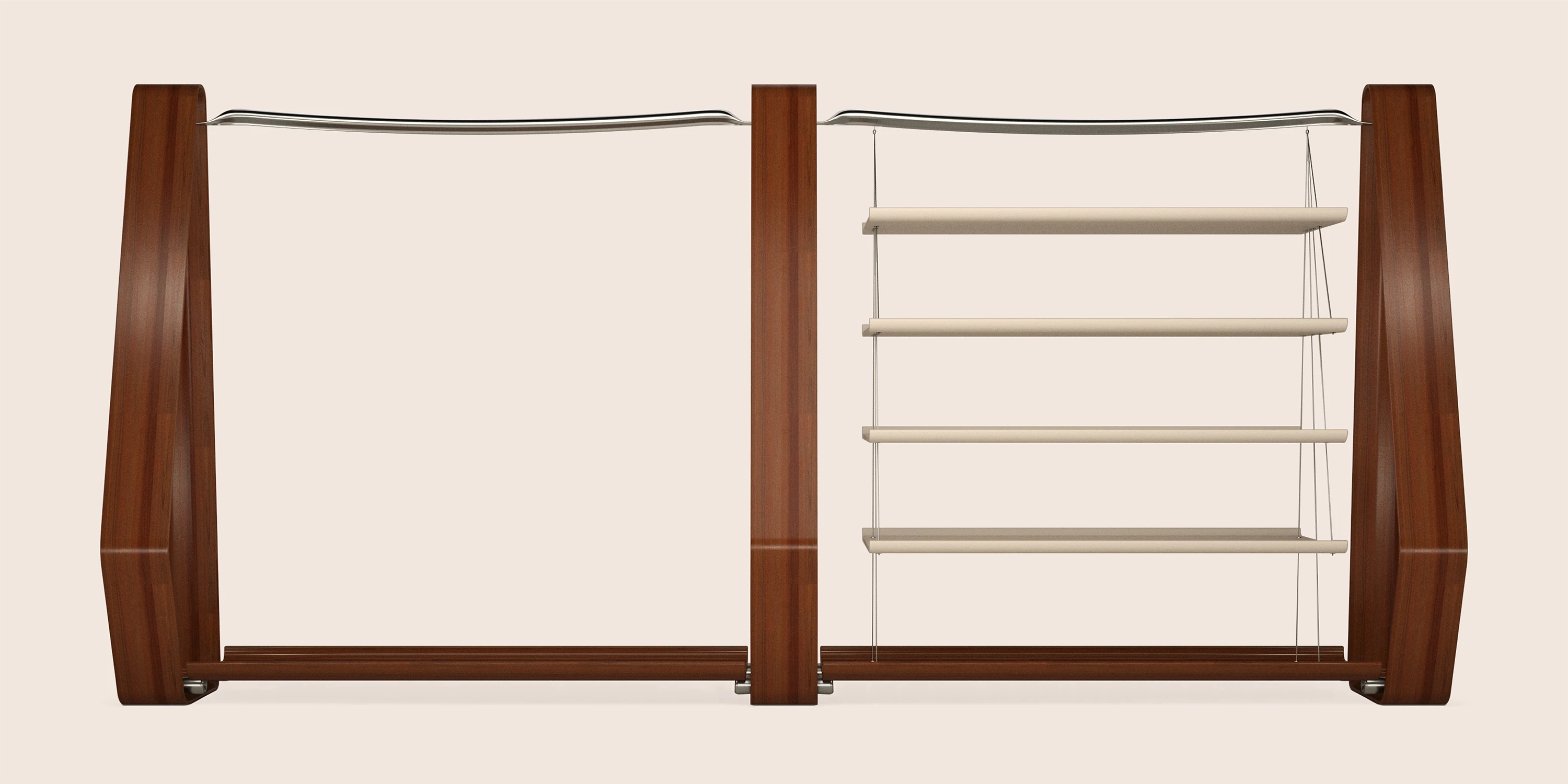 This clothes hanger was conceived in St Tropez for one of the most private spaces of the house: the walk-in closet. Designed to remove enclosure rather than add it, the piece treats the room itself as the wardrobe. Three seamless wooden elements define the structure, while gently curved aluminum bars span between them, shaped as if responding to a weight greater than what they hold, giving presence to garments yet to arrive. On one side, four full grain leather shelves are suspended by fine metal cables, appearing to float. Open, permeable, and precise, the hanger lightens the space while restoring gravity to everyday rituals.