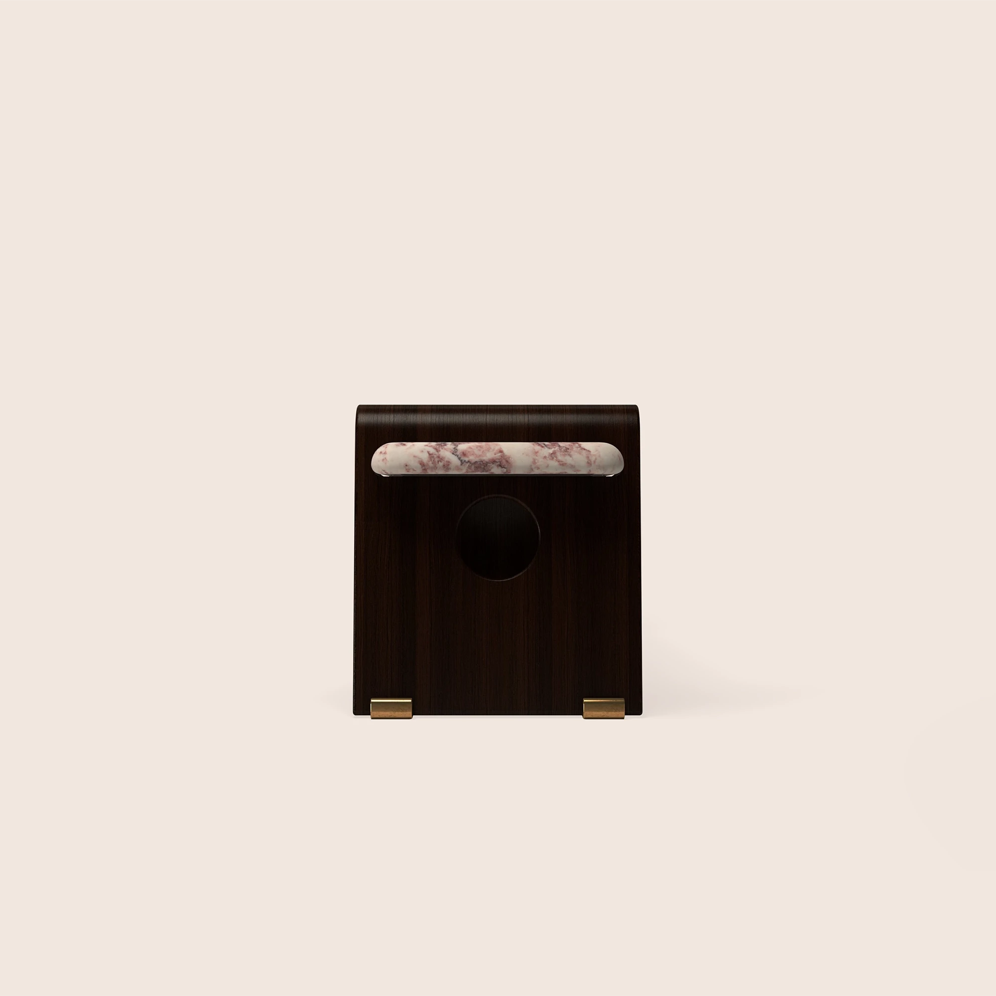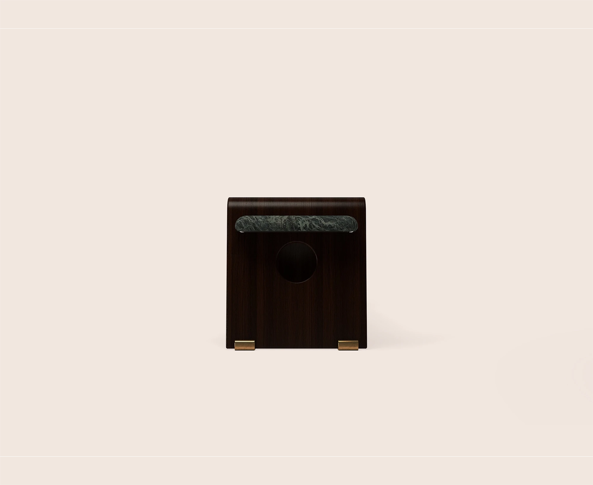 Maan Bedside Table is defined by metal and stone, with soft illumination integrated alongside brass hardware and a glass lightshade. It balances structure with light, its precise proportions refined through meticulous craftsmanship.”