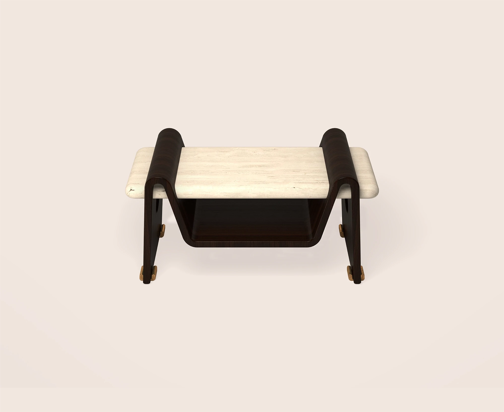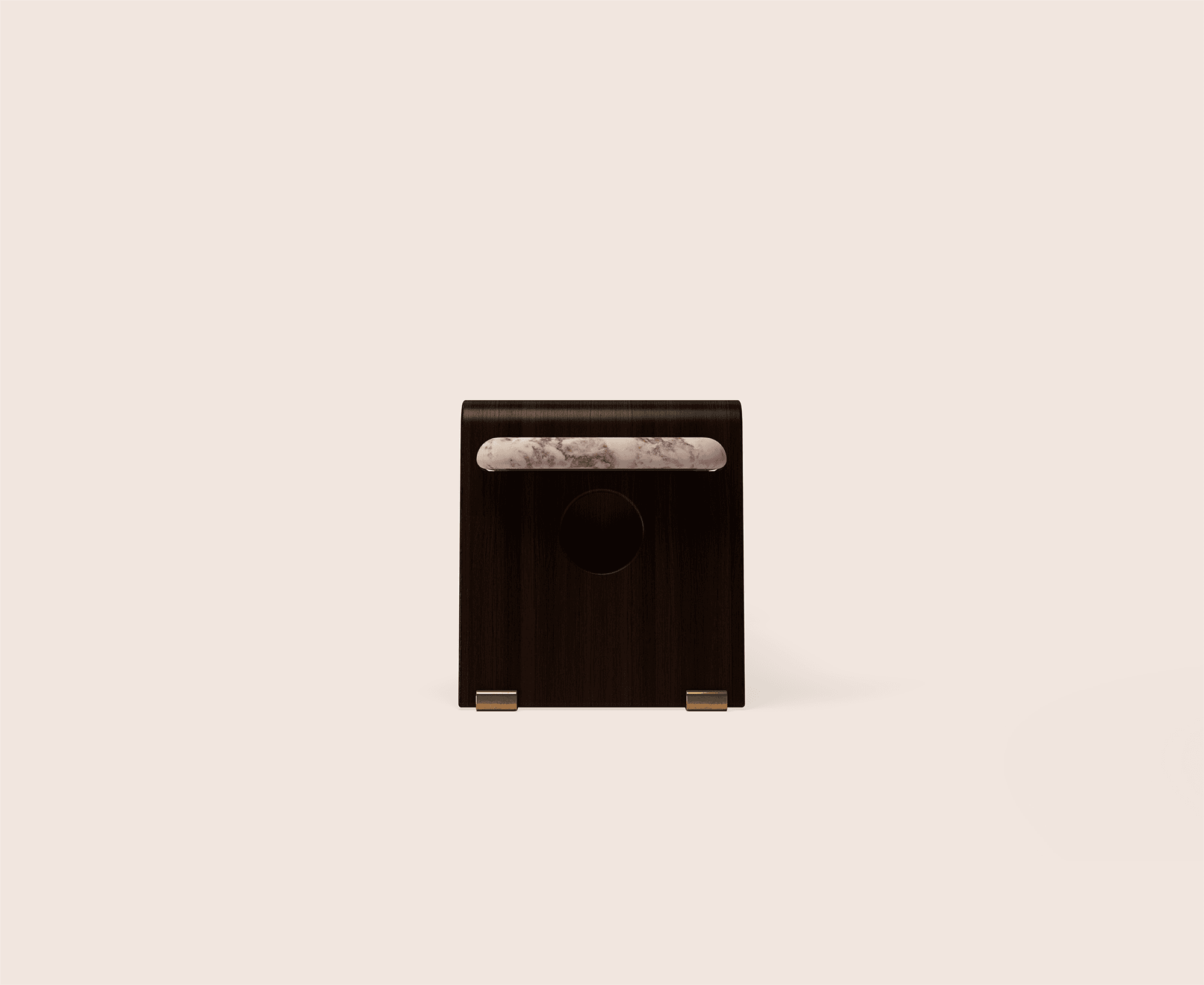 Maan Bedside Table is defined by metal and stone, with soft illumination integrated alongside brass hardware and a glass lightshade. It balances structure with light, its precise proportions refined through meticulous craftsmanship.”