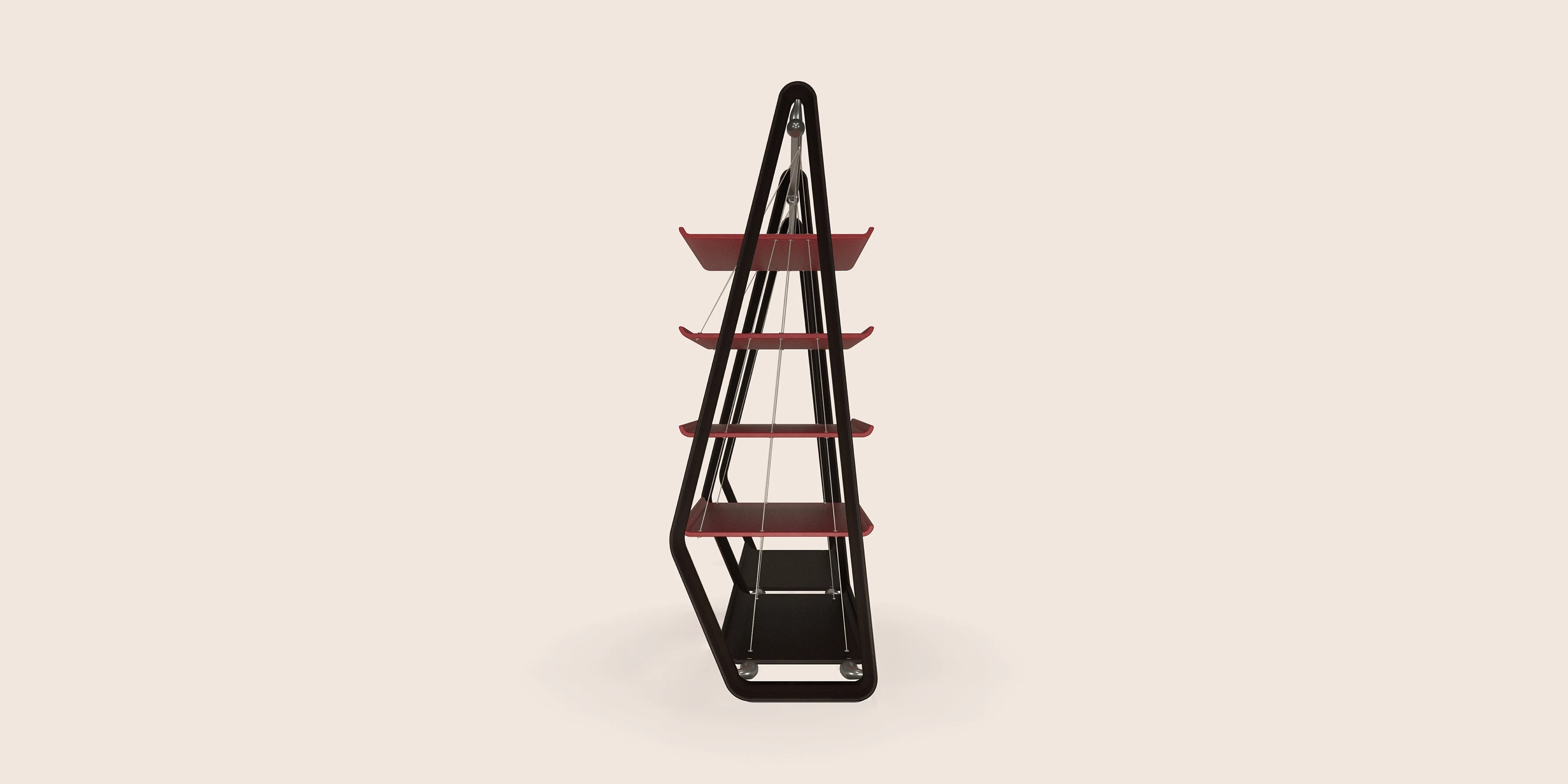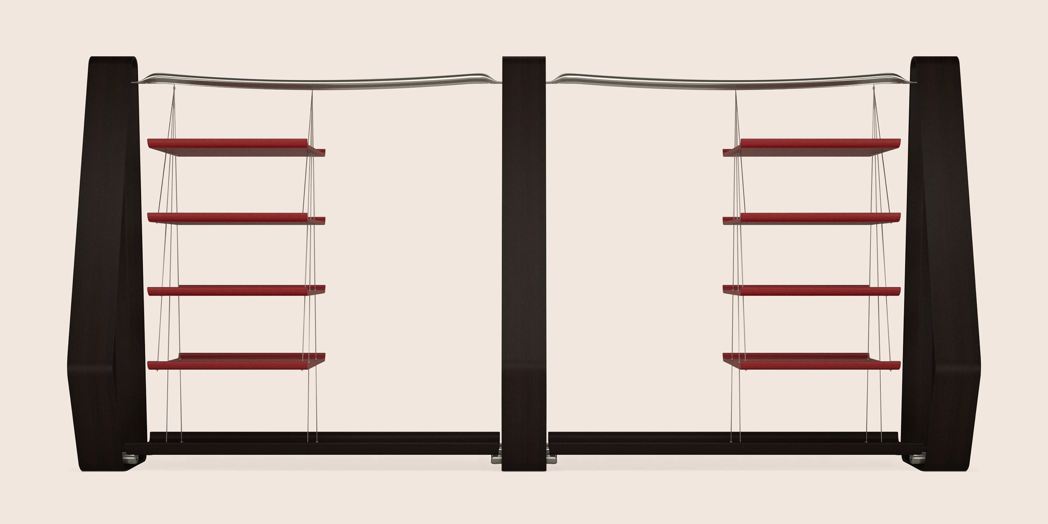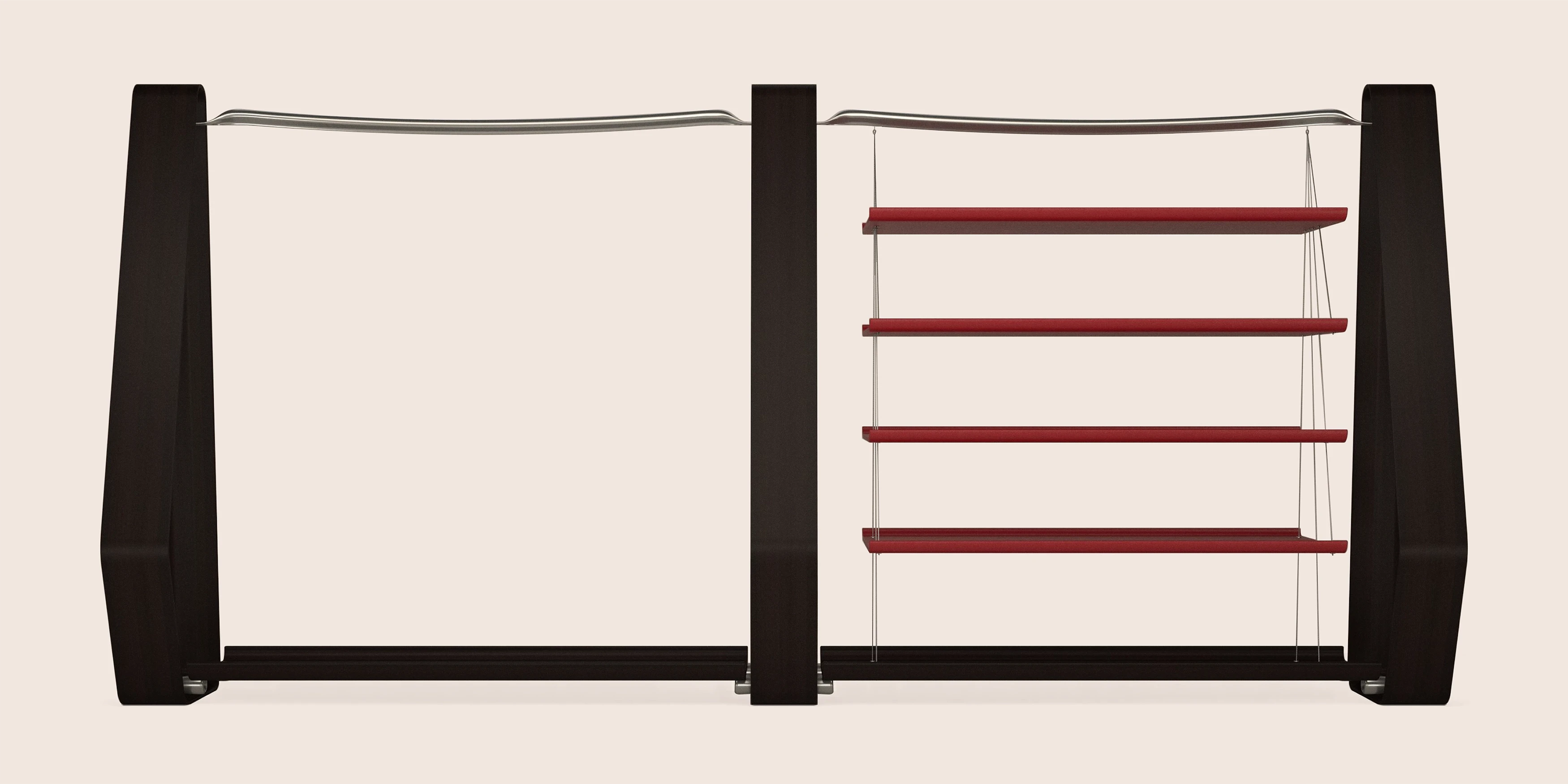 This clothes hanger was conceived in St Tropez for one of the most private spaces of the house: the walk-in closet. Designed to remove enclosure rather than add it, the piece treats the room itself as the wardrobe. Three seamless wooden elements define the structure, while gently curved aluminum bars span between them, shaped as if responding to a weight greater than what they hold, giving presence to garments yet to arrive. On one side, four full grain leather shelves are suspended by fine metal cables, appearing to float. Open, permeable, and precise, the hanger lightens the space while restoring gravity to everyday rituals.