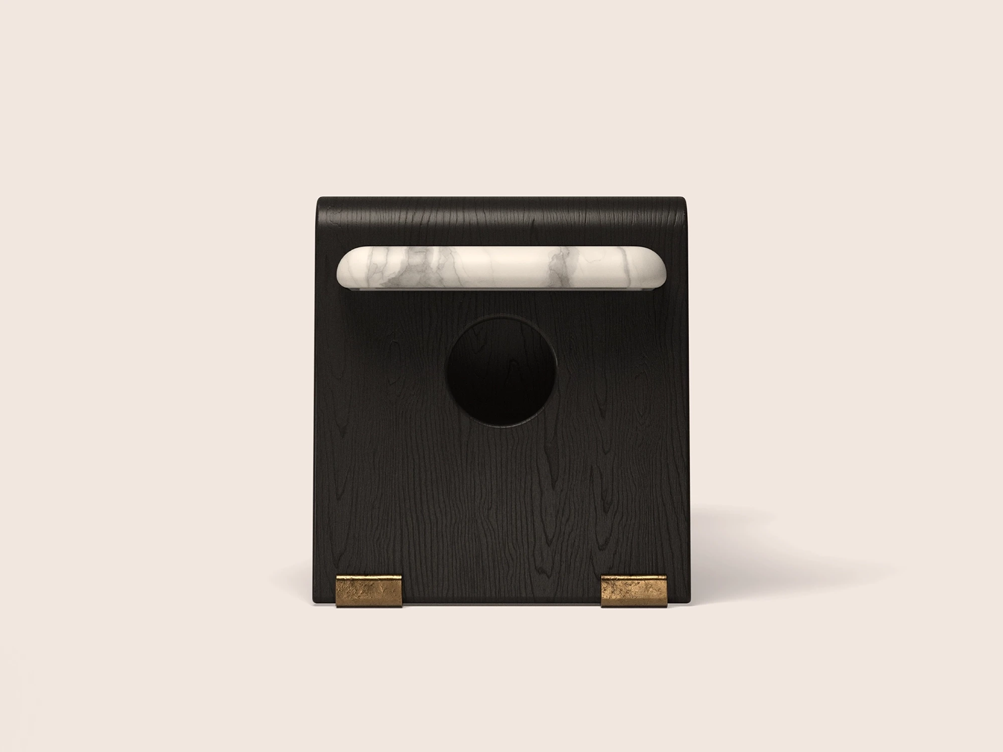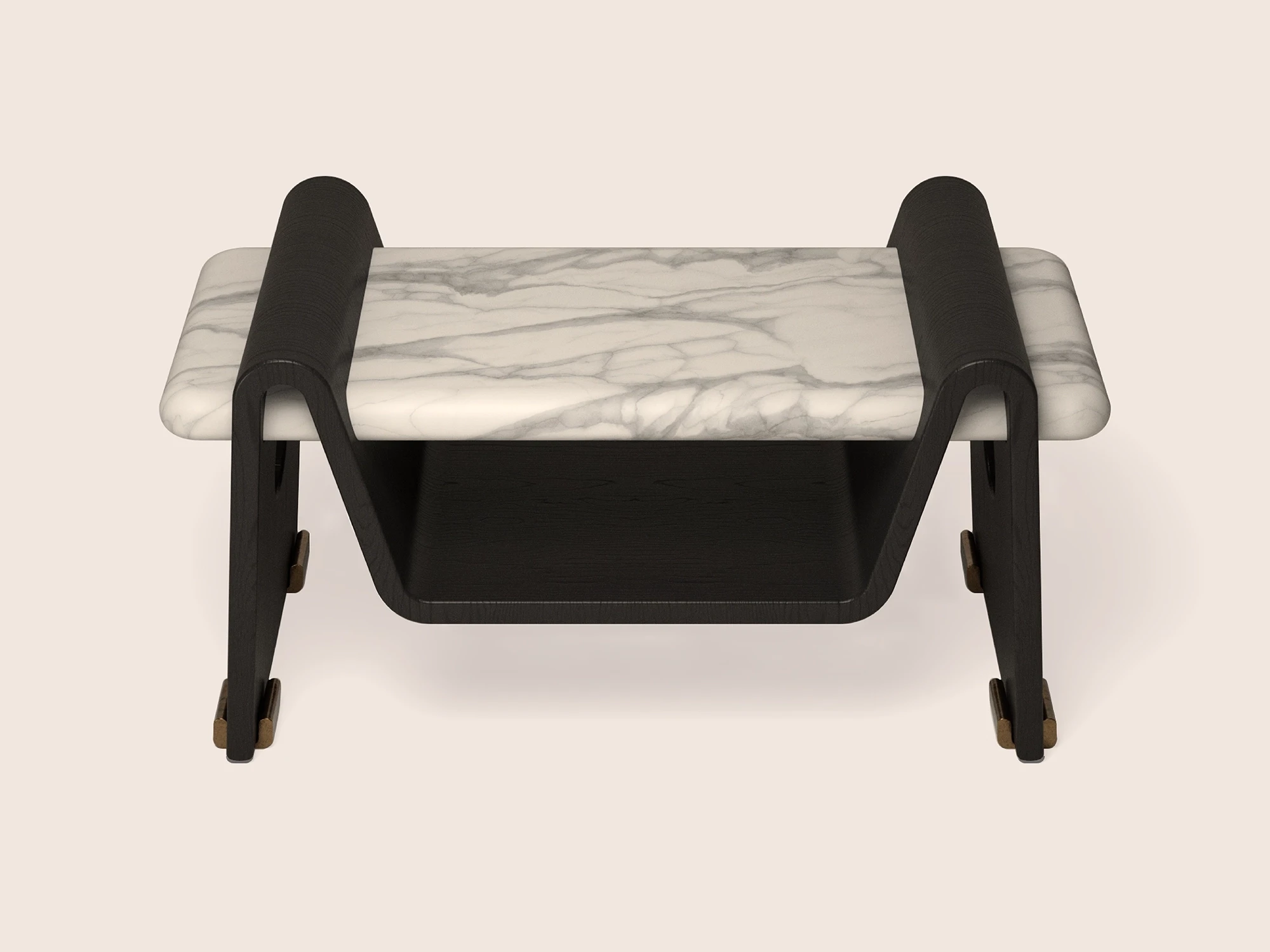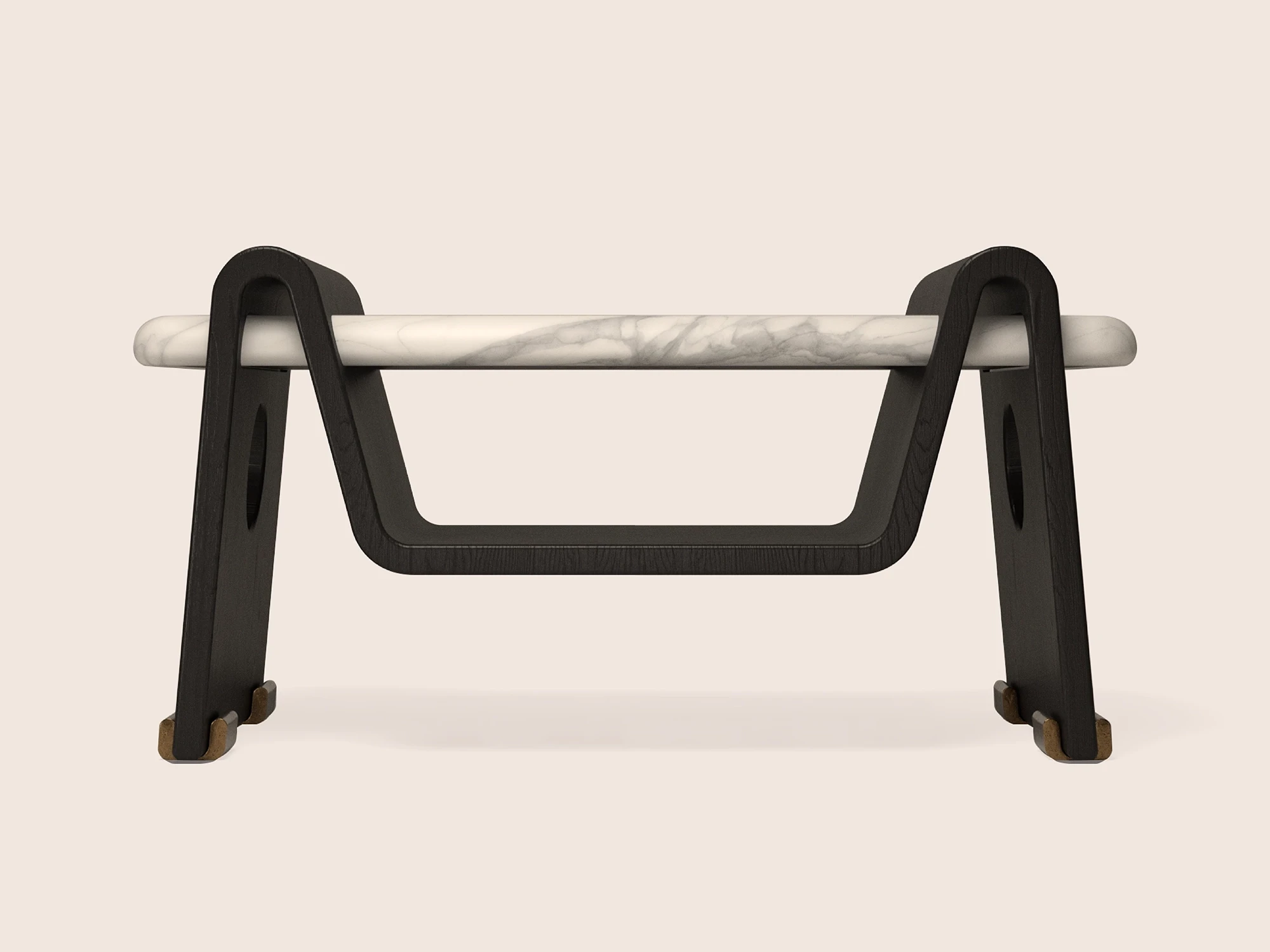 This bench was conceived for a tailored project in a villa on the island of St Martin. Imagined at the edge of the bed, facing the Caribbean Sea, it was designed to mark the day’s first and last gestures. A place to sit while entering the morning, and again before retreating into the private realm at night. That rhythm shaped its form. Solid ebonized oak grounds the piece, holding a marble top sliding seamlessly into its body, while aged brass feet quietly mark its contact with the floor—an object born from transition, repetition, and quiet resolve.