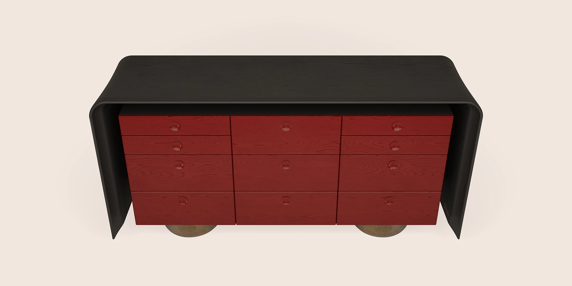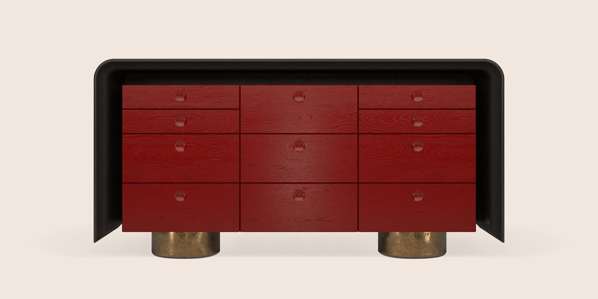 This chest of drawers was conceived as part of the same sequence of gestures within the walk-in closet, where preparation becomes order. Designed to hold what is selected and set aside, it gives structure to what precedes the night. A continuous body in varnished wenge wood frames a series of brushed oak drawers, finished in a deep red, each element contained within a clear rhythm. Hand-cast brass feet lift the piece slightly from the ground, grounding it while allowing it to remain light—an object shaped by clarity, repetition, and quiet control.